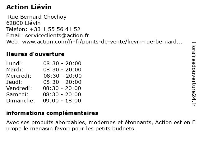 Trouver les points de vente. Ladresse les horaires ou le téléphone des commerces et services dans la ville de Auchy-les-Mines 62138. Habituellement Action Auchy-les-Mines est fermé le dimanche. Le second de 11h00 à 12h00 sera réservé à la découverte de lagility qui permettra daccueillir les nouvelles personnes. Modification des Horaires de lAgility débutant du Samedi matin. Cette semaine semaine 30 à Auchy-les-Mines il y a 2 catalogues Action de 12 pages au total.