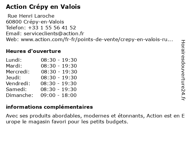 Horaire Action Crepy En Valois. Vous trouverez sur notre site de nombreux catalogues et pubs Action Crépy-en-Valois qui vous permettront de bénéficier de réductions exceptionnelles sur des produits tels que. NOUVELLE FORGE CREPY-EN-VALOIS - 60800 CREPY EN VALOIS. Trouver les points de vente. PAYS DOISE ET DHALATTE - 60700 LES AGEUX.