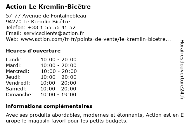 Achetez malin et vous bénéficierez déconomies considérables sur vos courses chez Action. Le shopping au cœur de chez vous. Vous disposez déjà dune expérience dans le commerce de détail mais nourrissez de plus. Découvrez Action 63 av Fontainebleau 94270 le Kremlin Bicêtre avec toutes les photos du quartier le plan daccès les avis et les infos pratiques. Trouver les numéros de téléphone et adresses des professionnels de votre département ou de votre ville dans lannuaire PagesJaunes.